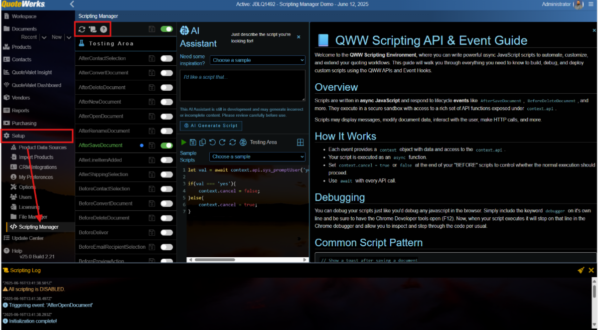 Scripting in QuoteWerks Web can be used to extend functionality based on system events. The QuoteWerks Web Scripting Manager is where you can write powerful async JavaScript scripts to automate, customize, and extend your quoting workflows. The Scripting Manager can be accessed via the left-hand navigation bar by clicking on Setup. Once in the Scripting Manager there are a few sections that you can use to build, test, and implement your scripts.