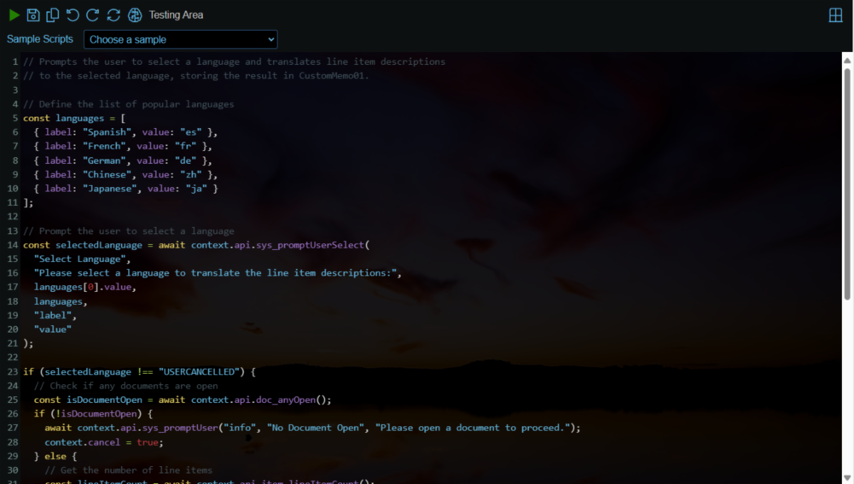 Clicking on Testing Area opens a window where you can choose sample scripts, write your own, and use the AI assistant. Simply select a sample or write your own script. When you are ready to test the script click on the play button. Once you are happy with the script you have built click on the save icon to save the script. You also have the ability to copy the script, undo and redo changes, reload the event script from the server, and access the AI Assistant, which can write scripts based on your prompts.