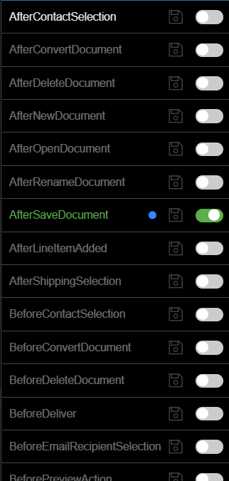 The Event Hooks list displays all of the events that can trigger a script. Each event can be toggled on or off and if changes are made you can commit those changes by clicking on the save icon. The save icon will display in red when there are uncommitted changes.