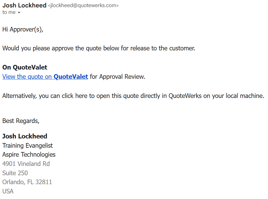 Submitting a note here will send an email to the person requesting approval with a link to the QuoteValet quote where they can view the note and take the appropriate action.