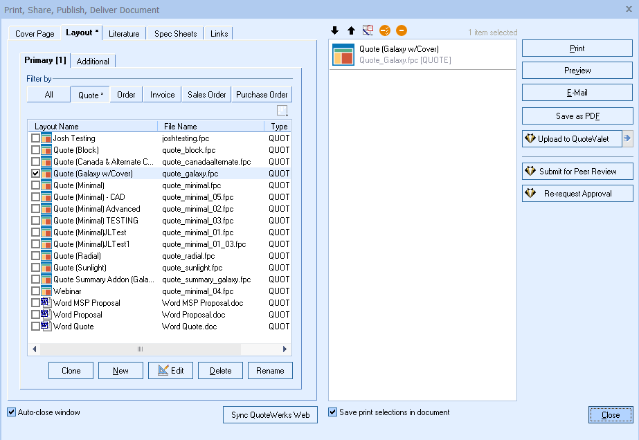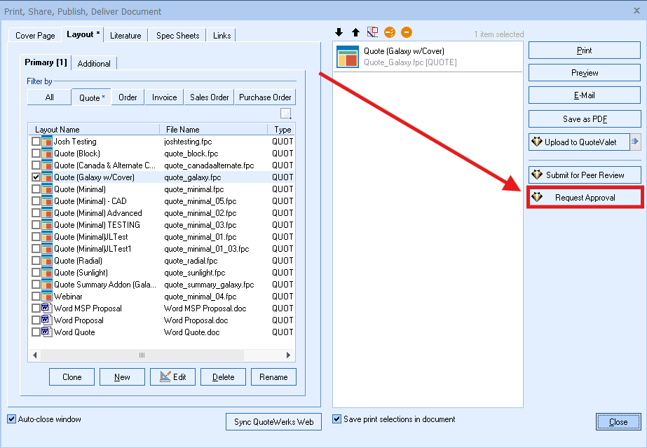 QuoteWerks offers robust Document Approvals and Peer Review features designed to maintain quote accuracy, ensure compliance with pricing or discounting rules, and support collaborative selling. These features are supported by QuoteValet. These tools help organizations enforce standardized quoting processes and reduce costly errors before quotes are sent to customers.