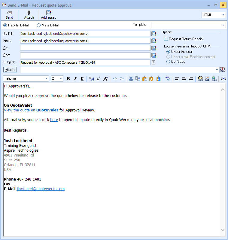To request approval the user needs to click the request approval button. This will open the send E-Mail window from which they can send the request to the designated approver(s).