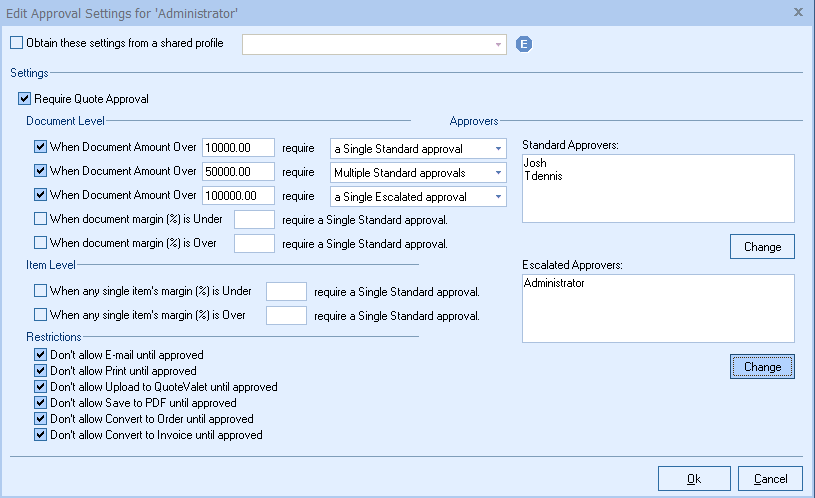 For Document Totals you can set up to three tiers of approval based on different thresholds. For example, you may want a Single Standard Approval for quotes over $10,000, Multiple Standard Approvals for quotes over $50,000, and a Single Escalated Approval for quotes over $100,000.